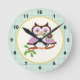 Spring owl with mint green plaid border wall clock, featuring a cute spring owl in purple and dark brown holding a flower in her beak (bill) on a branch with green leaves and mint green plaid pattern border on ivory background. You can change text and add your monogram or initials. An adorable, feminine design for owl lovers kids or women. Some elements by Trina Clark.