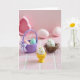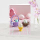 Designed with soft pastel tones, the front shows a glossy light pink tiled surface holding several decorative ovals arranged like a sweet little spring still life 🌷. In the foreground, a bright yellow egg cup holds a white oval sprinkled with sunny yellow dots, leaning in toward the rest of the display as if joining the group. To the right, a small twig nest cradles another white oval marked with neat black dots, tucked close like a quiet companion. Near the center sits a lavender basket with a slim arched handle, dressed with a white-and-purple striped ribbon bow tied at the side. Inside the basket, a blush pink oval and a mint green oval rest side by side, their close spacing suggesting a gentle bond 🐰. Soft, diffused lighting smooths the textures and keeps the colors calm, while the background fades into a blur of more pink tiling and a pale sculptural shape with rounded ear-like curves. The greeting “Happy Easter” appears near the top in small purple lettering, and a few out-of-focus pastel ovals trail off behind the basket.