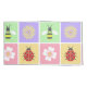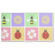 Pastel pink, yellow, purple, and green squares are adorned with ladybugs, dogwood blossoms, daisies, and honeybee and then bordered by tight white stitching to create a fun and sweet spring patch-like pattern.