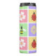 Pastel pink, yellow, purple, and green squares are adorned with ladybugs, dogwood blossoms, daisies, and honeybees and then bordered by tight white stitching to create a fun and sweet spring patch-like pattern.