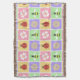 Pastel pink, yellow, purple, and green squares are adorned with ladybugs, dogwood blossoms, daisies, and honeybee and then bordered by tight white stitching to create a fun and sweet spring patch-like pattern.