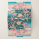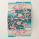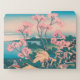 Japanese painting of people having a picnic under the cherry trees at spring blossom time, with Mount Fuji in the distance.