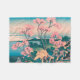 Japanese painting of people having a picnic under the cherry trees at spring blossom time, with Mount Fuji in the distance.