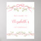 Cute 1st birthday welcome sign (poster) features a pink blossom border adorned with bows and butterflies.