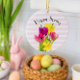 Decorate your Easter tree or kitchen cabinet knobs with this pretty spring flower ceramic ornament. This ornament features pink tulips and yellow daffodils with a pink and white stripe. A pretty floral ornament like this would be a thoughtful Easter gift for that special someone.