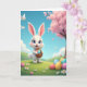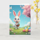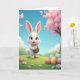 This card shows a fluffy white bunny with big blue eyes and rosy cheeks, holding a woven basket close to its chest as if it’s bringing a sweet surprise to someone special 🐰. The bunny stands front and center, and its gentle posture and soft, friendly gaze add a quiet touch of affection to the scene. Behind it, an azure sky stretches across the top with a few wispy clouds and tiny white birds gliding by. On the right side, a tall tree is covered in pale pink blossoms that drape like a canopy over the hillside, with a few petals suggested among the branches 🌷. Rolling green hills fill the lower half, sprinkled with small white daisies with golden centers. Across the grass, colorful eggs are scattered in different patterns—some dotted, some striped, and some with a smooth shine—leading the eye around the bunny. A short Easter greeting sits near the top in a soft pastel color, balanced above the bunny’s ears and below the open sky. The basket’s crisscross weave is clearly visible, with several bright eggs peeking over the rim near the bunny’s paws.