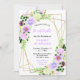 This fun and whimsical birthday party invitation features watercolor purple flowers and foliage on a gold geometric frame. The text combines handwritten script and serif fonts for a stylish and modern look. This is perfect for a spring or summer rustic birthday party.