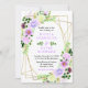 This fun and whimsical wedding invitation features watercolor purple flowers and foliage on a gold geometric frame. The text combines handwritten script and serif fonts for a stylish and modern look. This is perfect for a spring or summer rustic wedding.