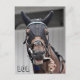 Fantastic photo of Spring Quality smiling and laughing out loud in a portrait closeup. This bay horse is wearing a black fly mask to cover his ears as he shows off his huge teeth "LOL"