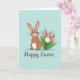 Designed with a sweet spring scene, this card features a stylized brown rabbit standing upright at the center against a soft blue-green background 🐰. The rabbit faces forward with long ears tipped in pink, a rosy nose and small smile, and bright eyes that feel like they’re meeting a friend’s gaze. A cream patch on its belly and fine whiskers add gentle detail that makes the character look tender and approachable. To the rabbit’s right, a cluster of tulip-like buds in rich pink rises from layered green leaves, with one fuller bloom showing many pale yellow petals 🌷. A faint shadow under the rabbit and flowers gives the scene a grounded, lightly romantic “standing together” feel without adding clutter. Near the bottom, a short Easter greeting appears in flowing plum lettering, centered and easy to read. The pink-tipped ears echo the pink blossoms, while the plum text sits neatly below the figures on the pastel field.
