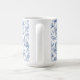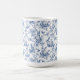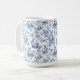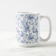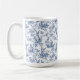 Charming Spring themed coffee mug features a blue and white Chinoiserie Toile de Jouy pattern with bunnies, butterflies and spring blooms.