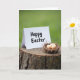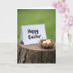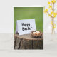 This card features a bright white greeting card standing on a rugged tree stump beside a small bird’s nest holding three pale brown eggs, with a gentle, close-together arrangement that feels quietly affectionate. Soft, diffused daylight falls across the scene, bringing out the rough grooves in the stump and the fine twigs woven into the nest. The background fades into a smooth green blur, like early spring leaves, keeping the focus on the card and nest in the foreground 🌷. The message sits centered on the front of the card in dark lettering that’s easy to read against the white surface. The card’s crisp edges and the nest’s curved shape sit side by side like two companions leaning in, creating a tender, friendly closeness without showing any people. Subtle color contrasts—white card, tan eggs, and earthy brown wood—make the still life feel calm and intimate 🐇. Three softly speckled eggs rest snugly in the nest, which is tucked against the stump’s cracked bark and visible growth rings.