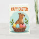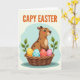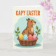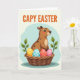 This design shows a large, friendly rodent-like creature in warm brown with tiny spots, big shining eyes, rosy cheeks, and a shy smile that feels like it’s meant for a close friend. It sits snugly in a textured woven basket, leaning in as if enjoying the company around it 🐰. The basket is filled with four decorated eggs: one yellow with white dots, one light blue with white dots, one red with dotted accents, and one pink with soft stripes. Two leafy green sprigs rise from either side of the basket, like a gentle frame that adds a quiet, affectionate touch. Behind the basket, a wavy teal shape sits on a creamy background, keeping the scene light and springlike 🌷. Across the top, a short Easter greeting appears in orange lettering, centered and easy to spot. The eggs show small dot patterns and stripe lines, and the teal shape curves like a soft hill beneath the basket.