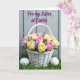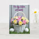 This design shows a white woven basket filled with roses in creamy yellow and soft blush pink, arranged like a small gift placed with care. Small purple blossoms are tucked between the roses, adding contrast and a gentle, flirty accent 🌷. The basket sits on thick green grass, suggesting an outdoor spring moment shared side by side. Two smooth white eggs rest low in the grass, like quiet clues of a seasonal celebration 🐰. Behind the scene, a muted gray wooden surface is softly blurred so the flowers stand out without feeling loud. Near the top, a flowing line of purple lettering is placed across the upper area, standing out clearly against the subdued background. Soft natural light falls across the petals and wicker, highlighting textures the way a close friend might notice tiny details. The purple text sits in the upper portion while the basket and eggs remain centered near the lower half against the green grass.