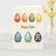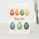 This greeting card features eight decorated egg shapes arranged in two neat rows of four on a soft cream background, like a shared spring display between friends 🌷. The eggs have a gentle watercolor look, with light washes and faint shadows underneath that make them feel softly set on the page. Across the top row, you’ll see a red egg with a white zigzag, a smooth orange egg, an olive green egg, and a bright yellow egg with small chevrons, creating a warm, welcoming run of color. The bottom row shifts cooler with a deep blue egg marked by sharp angular lines, a mint green egg with slim stripes, and a dark charcoal egg dotted with small white circles 🐇. Centered between the two rows, a flowing message sits like a quiet note passed between close companions. The lettering is placed horizontally in the middle and appears in a warm earthy brown, standing out gently without overpowering the artwork. Subtle lighting across the cream backdrop keeps the focus on the patterns, with each egg’s decoration feeling carefully chosen to complement the next. The final detail is the soft brown text nestled between the rows, framed by the eggs’ varied patterns and the light shadows beneath them.