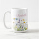 Custom script personal name Mug. A meadow full of watercolor wildflowers, butterflies and dragonfly. The name on both sides is in a peach script font with attached swirls/glyph on each side of the name for a feminine touch. You can keep them or delete. Try to write your name between the square icons and see before you decide.