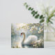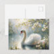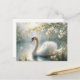 This floral avian postcard features a spring aesthetic dreamy painting of an elegant white swan gliding across a serene pond or lake.