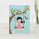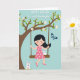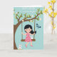 Designed with a gentle spring scene, the card shows a young girl with flowing dark hair in a pink polka-dot dress riding a wooden swing from a sturdy blossoming tree. Her rosy cheeks and soft smile, paired with the way she leans slightly toward the tiny white rabbit beside her, add a sweet note of friendship 🐰. Another small white rabbit peeks from the green grass near the tree’s base, as if watching the pair with quiet curiosity 🐇. The tree has a warm brown trunk and curved branches filled with fresh green leaves and small white blossoms with yellow centers. A deep blue butterfly floats through a pale blue sky, keeping the background calm and airy. Near the top, Easter greeting text sits neatly against the sky in a light, easy-to-read color, with smaller celebratory words tucked nearby. Soft pastel shades tie everything together, from the airy sky to the tender pink dress and the creamy white blossoms. The swing ropes hang straight down from the branch, and the wooden seat tilts slightly as the girl and rabbit ride together beneath the flowered canopy.