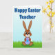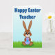 This card shows a friendly brown bunny 🐰 sitting near the bottom of the scene, with wide dark eyes and a big smile that feels like it’s meant for someone special. Its long ears stand tall, and a small white tail peeks out behind its rounded shape, adding a gentle, affectionate look. The bunny holds a round, candy-like pinwheel object with alternating light blue and soft lavender slices, like it’s offering a sweet treat to a close friend. Bright green grass stretches across the lower area in simple, tidy lines that keep the focus on the bunny’s warm expression. The sky above fades from pale blue to deeper blue, giving the background an open, springtime feel 🌷. Across the upper portion, a seasonal greeting and a short note of appreciation appear in large blue letters, centered and easy to read. The lettering has a subtle shadow that helps it stand out against the sky gradient. The circular pinwheel’s spokes radiate outward in neat segments of blue and lavender.