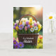 This card features a woven basket overflowing with spring flowers, arranged like a friendly bouquet passed from one caring sister to another ❤️. Tulips in soft pink, sunny yellow, white, deep purple, and orange mingle with daisy-like blooms that have white or violet petals and bright yellow centers. Gentle golden-hour light glows across the petals and picks out the texture of the basket weave, giving the scene a cozy, affectionate feel. In the foreground, a few violet-petaled flowers sit low in dew-touched grass, as if leaning in close like companions. The background fades into green foliage with small circles of light that make the garden feel calm and welcoming 🌼. The message “To a Wonderful Sister” appears centered on the front of the basket in a neat, light-colored font that stands out against the warm wicker. Around the basket, leafy greens frame the arrangement while soft highlights sparkle on the petals and the blurred light orbs hover behind.