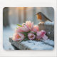 A robin perches on a snowy bench beside a bouquet of pink tulips, with a gentle sunrise in the background