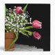 Tulip bouquet in clay pot on lace doily.