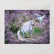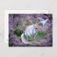 A delicately hued unicorn with lavender predominating in a similarly colored blooming spring trees background and a fantasy bird celebration of a fantastical spring postcard