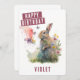 A cute birthday card featuring a rabbit during spring on the front with "Happy Birthday" in a white, all-caps bold font. Personalize the front by adding your name(s). The back of the card features space for your typed or handwritten message.