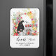 Custom wedding thank you magnet favors for your guests, featuring a bride and groom gnomes and a colorful spring floral arch illustration. Edit the template with a date and the newlyweds' names.