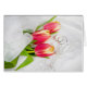 Pair of wedding ringss on bridal pillow with spring tulip bouquet.