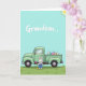 A warm message of spring unfolds in a soft pastel scene, with a mint-green pickup truck parked on bright green grass under an aqua sky. The truck’s open bed is filled with patterned oval eggs in assorted colors and simple decorative motifs, suggesting a seasonal celebration 🌷. Beside the truck stands a white bunny with long ears and rosy cheeks, wearing blue overalls and facing slightly toward the viewer with a gentle, friendly posture 🐰. One paw extends a pink tulip as if offering it to someone just out of frame, adding a quiet note of affection and closeness to the moment. Near its feet sits a small golden egg, placed like a tiny treasure that draws your eye downward. Across the upper sky, an affectionate greeting appears in white cursive lettering, centered and easy to read against the blue background. In the upper-right corner, a stylized yellow sun with short rays glows above the scene.