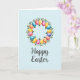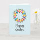 This greeting card features a circular garland near the top center, made of pastel egg-shaped forms that suggest a gentle, friendly closeness like shared springtime moments. Each egg shows a soft watercolor gradient moving through sunny yellow, tender pink, calm blue, warm orange, and light lavender, with small green sprigs weaving between them for a fresh garden feel 🌷. The background is a pale, airy blue that keeps the scene light and open, letting the colors sit softly without feeling heavy. Beneath the garland, a short holiday message is centered and written in flowing cursive-style lettering in deep charcoal. The smooth curves of the lettering echo the rounded shapes above, tying the design together in a way that feels affectionate and welcoming 🐰. Gentle, diffused shading gives the eggs a softly painted look, as if they were brushed on with water and left to dry naturally. Tiny leaves and thin stems tuck around the eggs, adding small touches of green that frame the circle without crowding it.