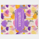 A lively, bold, purple and yellow floral pattern, with an illustration of cascading tulips on a cream background.