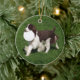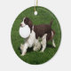 This is a round, ceramic Christmas ornament, featuring an original photograph of a regal, liver & white English Springer Spaniel running with a frizbee, with green grass background.