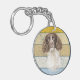 This keychain features a portrait of a beautiful brown and white Springer Spaniel dog. The image is placed on a retro, slightly distressed tan, gold, and blue retro style striped background. The back has a solid blue background with your text in two fields.