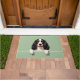 The soft meadow green background adds a fresh and natural touch, perfect for welcoming entryways. Designed with extra space at the top and bottom, it allows easy personalization with names, welcome messages, or custom text—making it ideal for unique dog-themed doormats and thoughtful gifts.