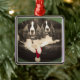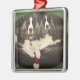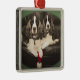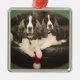A square framed Christmas ornament, featuring an original photograph of two liver & white English Springer Spaniels sitting together with a Santa hat.