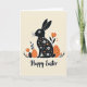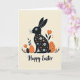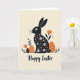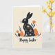 This card features a long-eared rabbit silhouette at the center 🐇, shown in deep black and filled with small white blossoms and warm orange flower shapes that feel like a gentle gift of spring. On either side sit two egg-like shapes, one solid orange and the other black with orange dots, arranged evenly as if they’re keeping the rabbit company like close friends. Simple flowers rise around them with orange petals and thin black stems, while small clusters of dark leaves rest near the bottom for a grounded, cozy garden scene 🌷. The background stays a soft cream, letting the black, white, and orange details stand out without crowding the page. The rabbit’s floral pattern adds a tender, affectionate touch, like a quiet bouquet offered without words. A short Easter greeting sits along the bottom in black lettering, centered beneath the main illustration. The orange egg is on the left, the dotted black egg is on the right, and the tall orange blooms frame the trio from both sides.