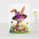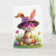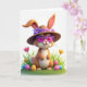 This card shows a light-brown bunny centered on a white background, with long ears and a soft, plush look that feels friendly and a little flirty 🐰. It wears purple sunglasses with magenta lenses, giving it a cool, modern edge, and its gentle smile suggests it’s sharing a private joke with someone close. A wide-brimmed brown hat sits on its head, trimmed with a purple band and small violet flowers that add a sweet, springtime touch 🌷. Along the bottom, a sweep of green grass frames the scene like a little garden stage. Nestled in the grass are polka-dotted eggs in pink, yellow, and blue, placed as if they were arranged for a thoughtful surprise. A few tulip-like blooms in matching colors pop up nearby, echoing the bunny’s accessories and adding balance. There is no text on the front, leaving the bright white space above the bunny open and airy, while the hat’s purple band and tiny violet flowers stand out in crisp detail.