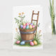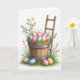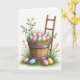 Designed with a soft watercolor look, this Easter card captures early spring with a rustic wooden barrel at the center, showing clear wood grain and weathered metal bands. The barrel overflows with delicately patterned egg shapes in gentle pastel pink, sky blue, buttery yellow, and light lavender, each dotted with deeper speckles, like a sweet shared find 🐰. Fresh green grass spills over the rim and tumbles down the sides, adding a cozy, gathered-together feel to the scene. To the right, a simple wooden ladder in warm brown leans in close, as if someone just stepped away after setting things up for a friend. Behind and around the barrel, thin branches carry pale pink five-petaled blossoms and new green leaves, framing the arrangement with a tender, welcoming touch 🌷. A few decorated eggs rest at the base in thick tufts of grass, with open white space all around that keeps the focus on the soft colors and textures. There’s no text printed on the front, leaving the bright white background clear above the barrel and ladder.