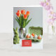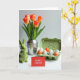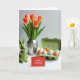 The front design shows a spring still-life arranged on a white tabletop against a soft neutral background, lit with gentle, diffused light. On the left sits a glossy lime-green ceramic hare 🐰, angled as if quietly watching the display with a calm, affectionate presence. Just behind it, five full blossoms shift from deep orange to pale apricot, gathered in a shiny metallic vase with horizontal ridges that catch small highlights. To the right, an open muted-green carton holds several decorated eggs, mixing solid orange and white ones with others covered in black polka dots and orange-and-white stripes for a lively contrast. In the foreground, a bright red rectangular card leans toward the viewer like a friendly note left for someone special, adding a hint of closeness to the scene. The seasonal text is placed centered on the red card in white lettering, standing out crisply against the scarlet surface 🌷. Soft shadows fall beneath the hare, the vase, and the carton, while the glossy ceramic and smooth eggs reflect small points of light.