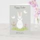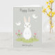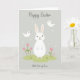This card features a stylized white bunny 🐰 with long upright ears shaded peach-pink inside, a tiny peach nose, and small black eyes that read as soft and shy. It stands on a rounded patch of pale green ground, like a fresh meadow, while two slim stems with pale pink blossoms rise on either side as if gently leaning in to keep it company. Above, two small white birds with rosy cheeks and dark eyes drift close together, their spacing suggesting a tender, companionable glide. A scattering of soft white dots floats around them, like light petals or a quiet spring drizzle against the smooth pale gray background. The words “Happy Easter” sit near the top in dark lettering, while “With Lots of Love” appears at the bottom in matching dark text, framing the scene without crowding it. The pastel palette keeps everything calm and affectionate, with the bunny and blossoms forming a cozy center as the birds hover overhead 🐇. The blossoms are a soft pink with simple rounded petals, and the green ground is a muted mint tone with a smooth curved edge.