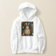 The Springtime Bunny Magic hoodie features a pure white rabbit in a lush pink floral garden with fresh carrots, creating a charming and stylish Easter look perfect for springtime fashion.