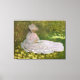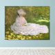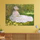 Springtime by Claude Monet, oil on canvas 1872, is a landscape painting of a young woman in billowing white dress and white bonnet seated in the shade beneath a group of trees, reading a book. Around her the intense light of the warm spring sun breaks through the leaves of the trees, dappling the bright green grass and her dress with intense flecks of sunlight. Monet painted the image in quickly applied, loose brush strokes of oil colors, capturing a pastoral moment of repose of the woman amid nature. The range of values from light to dark and harmonies of green, brown, grey and white tones capture the light, color and atmosphere of a scene painted from life.