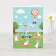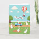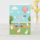 This card shows a spring scene with layered bands of green grass and a light brown path leading toward a white picket fence and two tall trees with brown trunks. In the soft blue sky, rounded white clouds drift above the action, keeping the mood light and airy. Several long-eared white rabbits 🐰 are spread across the lawn, and a couple lean toward tiny yellow bird friends as if sharing a sweet, friendly hello. One rabbit drives a light blue convertible with a red interior along the path, while another kneels at a patch of dark soil, paws busy as if preparing a small surprise. Up high, a red-and-white striped hot air balloon floats overhead, and in its basket a rabbit rides a red bicycle, adding a playful sense of togetherness from above. Across the upper middle area, a curved banner carries the greeting in a bright, easy-to-read color, centered so it stands out against the sky 🌷. Small shadows sit beneath the rabbits, the car, and the balloon basket, grounding the figures against the pastel background.
