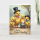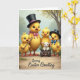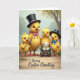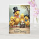 This design shows a spring scene with four fluffy, golden-yellow young birds gathered on a rustic dirt path beneath softly painted trees and gentle light 🌷. The tallest bird wears a black top hat with a pink band and a matching bow, standing a little forward as if leading friends with a calm, caring glance. Close by, a smaller bird holds a shiny silver horn, angled toward the group like it’s about to play a sweet tune for someone special 🐰. Another petite bird echoes the formal look with its own black top hat and a cheerful blue bow, leaning in as if sharing a private joke. A tiny white, woolly animal with pink ears sits nestled in a small wooden cart filled with bright green grass, looking up with wide eyes that invite a soft, affectionate smile. Warm sunshine yellows, leafy greens, and earthy browns blend together, highlighting rosy cheeks, rounded shapes, and orange webbed feet. The greeting appears near the top in a gentle pastel tone, while a short sign-off sits near the bottom in a darker shade for contrast. In the background, the trees fade into a misty wash of color, framing the path and the little cart.