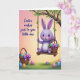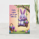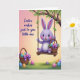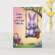 This card features a plump lavender bunny with wide, shining eyes and rosy cheeks, sitting on a rustic wooden swing and smiling as if it’s sharing a private joke with someone close 🐰. The swing hangs from a sturdy tree branch dotted with small green leaves, and the textured ropes look slightly twisted as they drop down on either side. Cradled in the bunny’s arms is a woven basket filled with decorated oval eggs in many colors, finished with a rich purple bow that echoes the bunny’s soft tones. A second basket rests in the grassy foreground, suggesting a sweet shared moment, like two friends gathering treats side by side 🌷. Behind everything, the sky fades from rosy pink at the top into peach and then a gentle yellow glow near the horizon, bathing the scene in warm light. On the left side, a short Easter greeting appears in a flowing, cursive style, set in a dark tone that stands out against the pastel background. Scattered across the green grass are more patterned eggs, and the tree branch frames the swing overhead with fresh leaves.