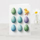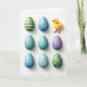 This design shows nine smooth, egg-shaped forms arranged in a neat three-by-three grid on a bright white background, like a tidy little spring display 🌷. Each egg has its own look, mixing calm blues, fresh greens, and a hint of soft lavender in patterns such as dots, stripes, small flowers, and starburst rays. The even lighting adds gentle, soft-edged shadows under each shape, giving the layout a quiet sense of depth. In the upper-right area, a tiny sun-yellow chick stands near the eggs, adding a sweet, friendly moment as if it has wandered in to join the scene 🐇. Its wide eyes and slight lean toward the nearest egg suggest curious company rather than being alone. A short Easter greeting sits near the top in light lavender letters, with a smaller line of text centered below in soft green. The chick has a small orange beak and tiny feet, and its fluffy texture contrasts with the eggs’ smooth, matte surfaces.
