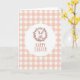 This card features a bright white oval centered on a soft checkered background of muted peach-orange and white squares, like a cozy tablecloth on a spring morning 🌷. Inside the oval, a reddish-brown line drawing shows a long-eared rabbit gently holding a smaller companion, their faces tilted close in a tender, caring pose 🐰. A wreath of budding flowers and curling branches wraps around them, adding a natural frame that feels like twigs and blossoms gathered by hand. The warm earth-tone ink stands out against the white space, keeping the focus on the affectionate pair and their quiet connection. Below the oval, a short Easter greeting appears in simple uppercase letters, centered and printed in the same reddish-brown color. The background stays softly diffused while the central lines remain crisp, giving the scene a calm, intimate look. Small leaf tips and flower buds dot the wreath evenly, with thin branch lines looping toward the lower sides of the oval.