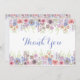 This elegant thank you card features a beautiful Springtime flower garden in shades of purple, pink and blue across the top and bottom. Thank You is written in the middle in a pretty script font. On the reverse side is a small floral garden across the top.